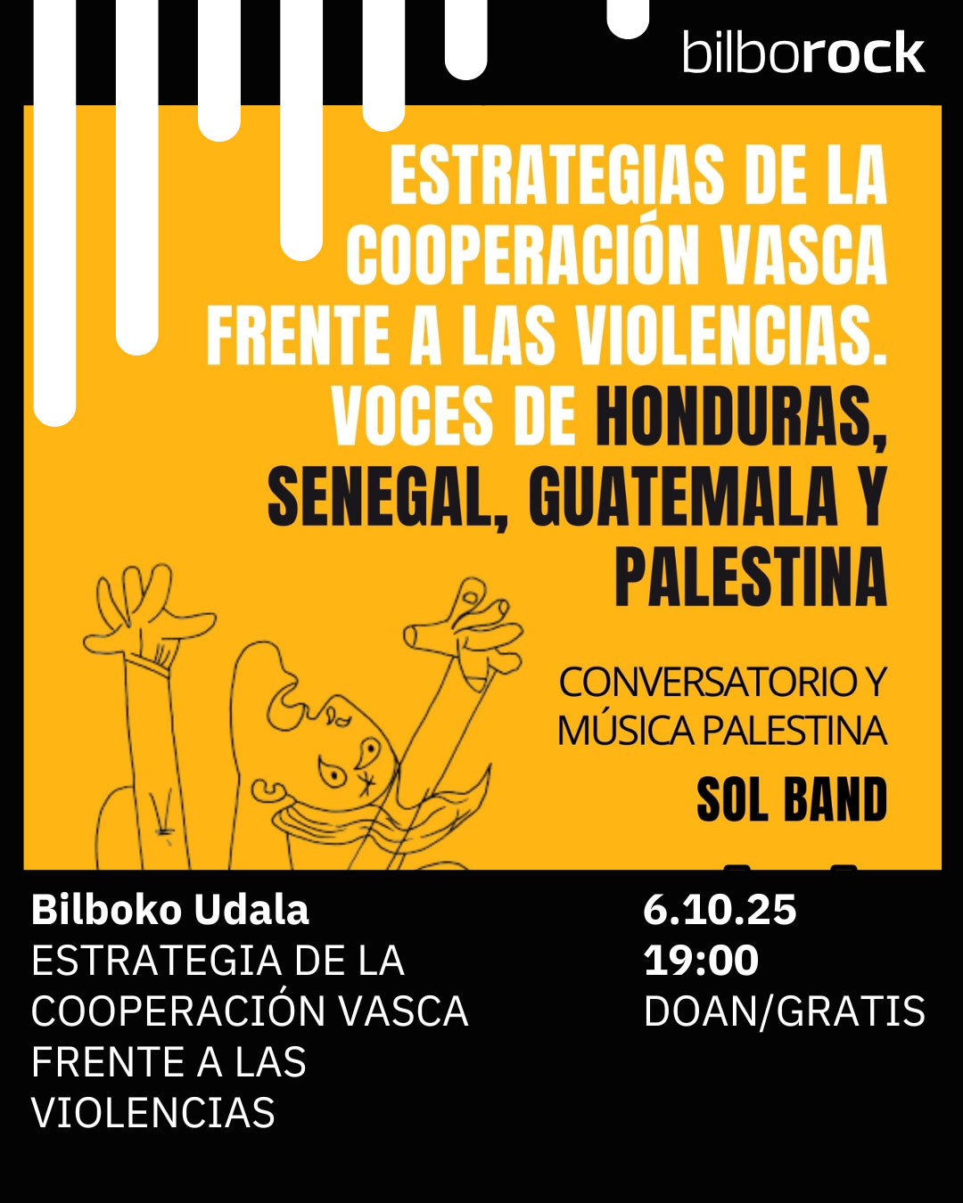 Euskal lankidetzaren estrategiak indarkeriaren aurrean. Honduras, Senegal, Guatemala eta Palestinako ahotsak. Solasaldia eta palestinar musika Sol Band-ekin.