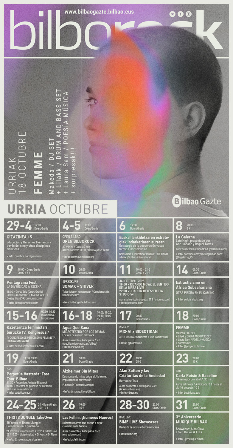 Musika eta arte eszenikoen jaialdia, Euskadin aniztasuna, berdintasuna, duintasuna eta gizarteratzea oinarri hartuta eraldaketa soziala bultzatzen duena. 18:00 (DOAN): Gorsy Edu – Hitzaren boterea. 20:00 (8 )€: 44 SVVAGE + MADMUASEL + Deejay Ziza.