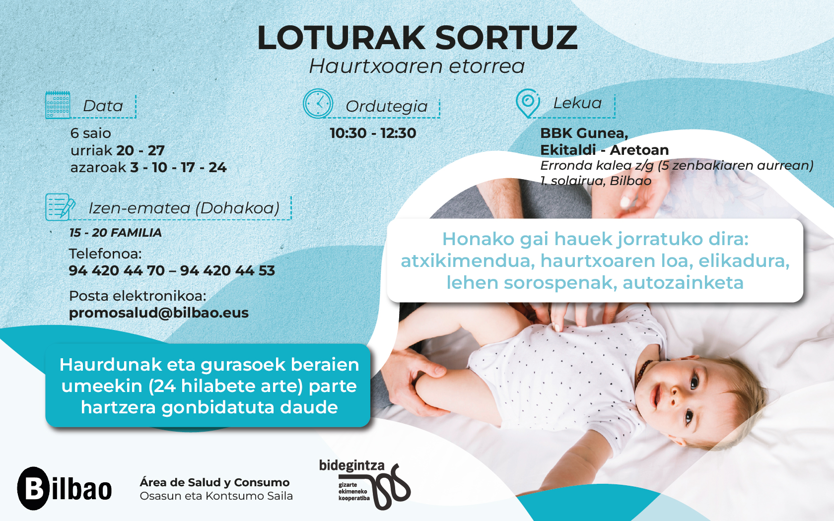 Bilboko Udaleko Osasun eta Kontsumo Sailak antolatu du “Loturak sortuz: haurtxoaren etorrera” tailerra. Saioen datak honako hauek dira: urriaren 20 eta 27an, eta azaroaren 3, 10, 17 eta 24an (ordutegia: 10:30-12:30). Lekua BBK Gunea da